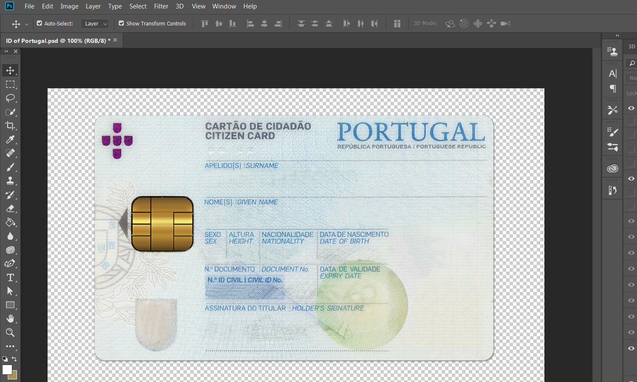 Portugal ID Card fake template psd. Portugal fake id card psd file download for account verification | Portugal Id card fake psd Template free download | Fake ID Card photoshop document Templates . The Citizen Card (Portuguese: Cartão de cidadão) or CC is an identity card issued by the Portuguese government to its citizens. The card replaces several previous documents, including the Bilhete de Identidade (BI; Identity Card), Social Security card, National Health Service card, Taxpayer card and voter registration card, in one secure card. The Citizen Card was first issued in the Azores in mid-2006. There is a fake ID card on the back and front of all ID cards and driver’s licenses that you can use.