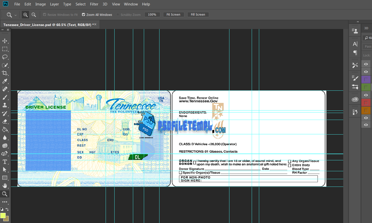 Tennessee driver license template. A regular driver’s license (Class D license) is a permit that a driver must possess in order to operate passenger vehicles with a GVWR (Gross Vehicle Weight Rating) of 26,000lbs. in Tennessee driving license psd template & Main and important specifications | drivers license template psd free download . The vehicles should not be used for transporting: